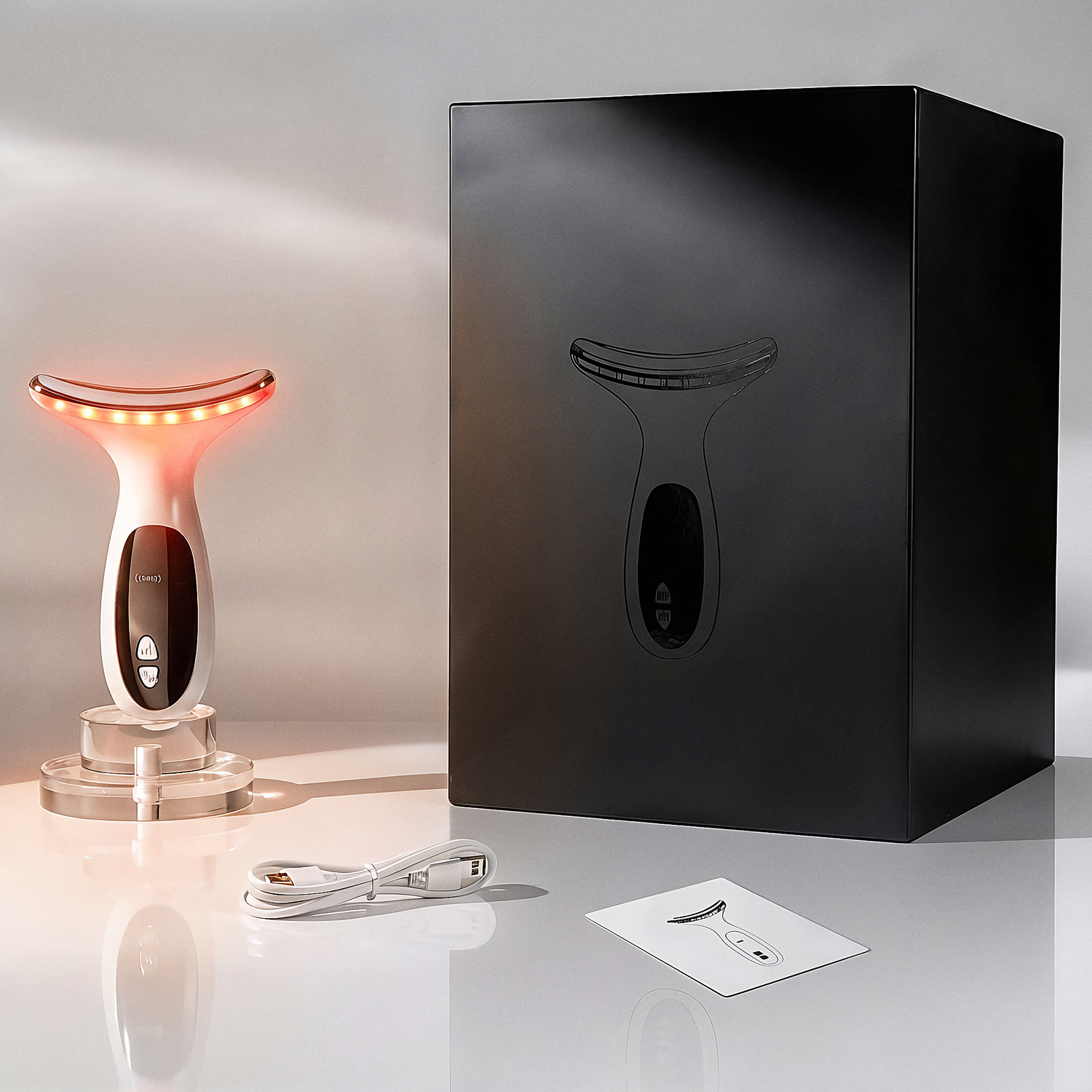 Open the box and you're ready to go—no hidden accessories to purchase, no complicated setup. Inside you'll find the LED Facial Sculptor device, a USB-C charging cable (works with any phone charger or laptop), and a detailed instruction manual with treatment modes, intensity settings, and step-by-step guidance.