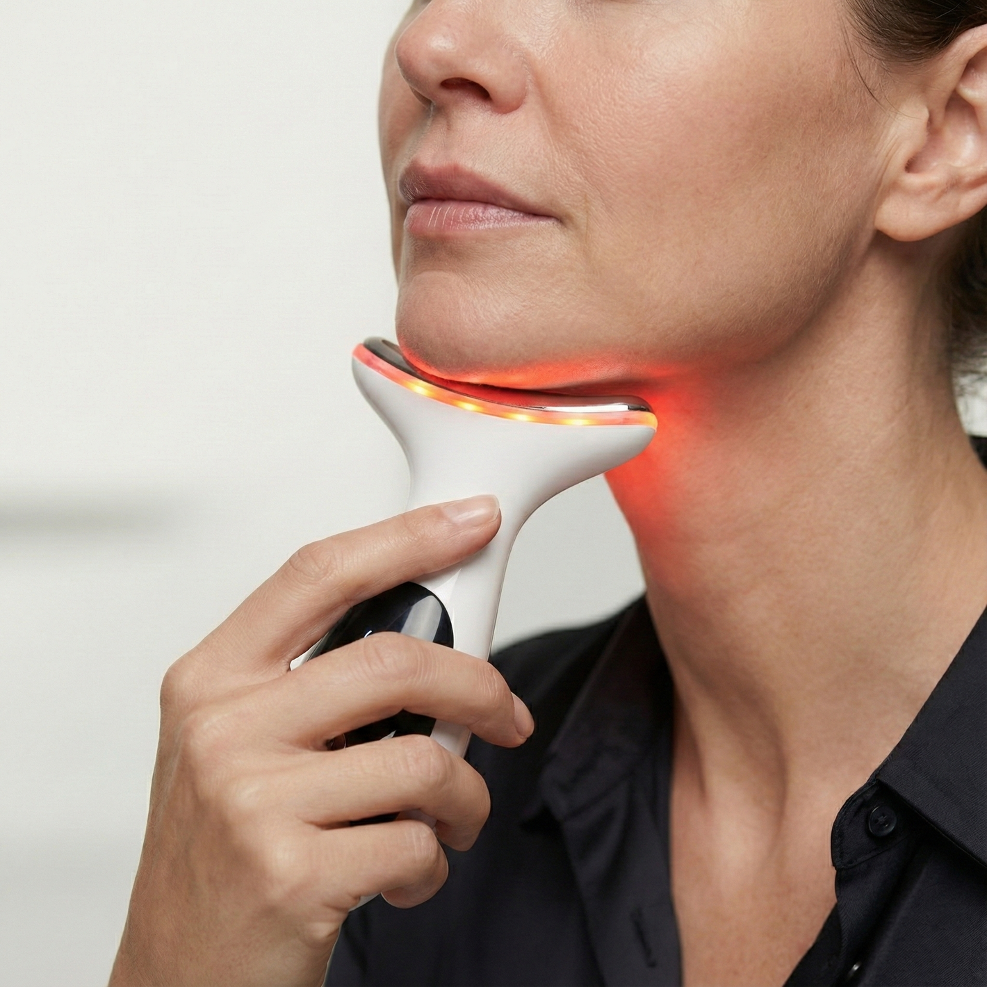 EMS + Red Light tone muscles and tighten skin to reduce double chin and create a sharper profile.