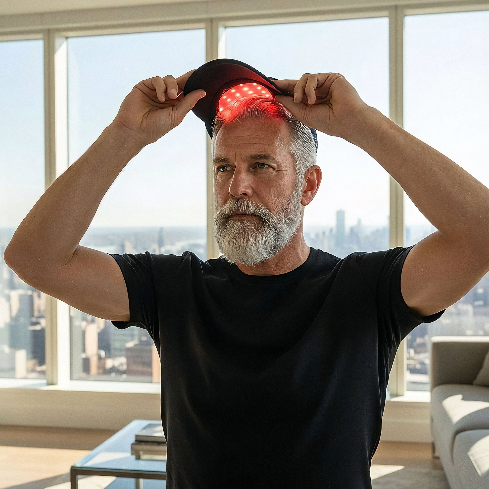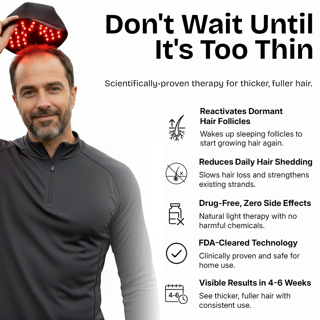 660nm red light penetrates 2-3mm into your scalp to improve blood circulation, reduce inflammation, and strengthen existing hair. This keeps the hair you still have anchored while creating the optimal scalp environment for growth.