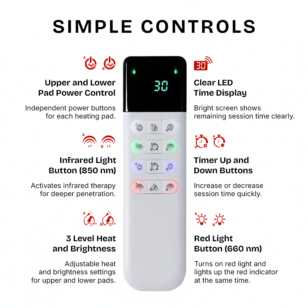 3 adjustable heat levels (104°F to 112°F) add therapeutic warmth that relaxes tight muscles, increases circulation, and enhances light penetration. Start on low heat for gentle relaxation or increase to high for deep muscle relief.
